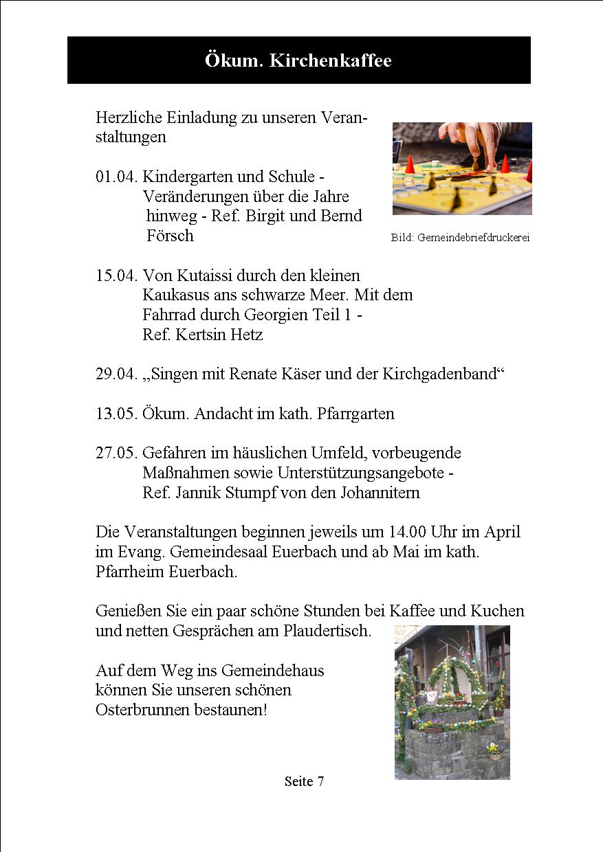 Hier erhalten sie immer wieder aktualisierte Infos über das Programm des ökumenischen Kirchenkaffees.Die Treffen finden alle 14 Tage in den Wintermonaten im Evang. Gemeindesaal und in den Sommermonaten im kath. Pfarrheim in Euerbach statt Das aktuelle ProgrammHerzliche Einladung zum unseren Nachmittagen Ökum. Kirchenkaffee Euerbach